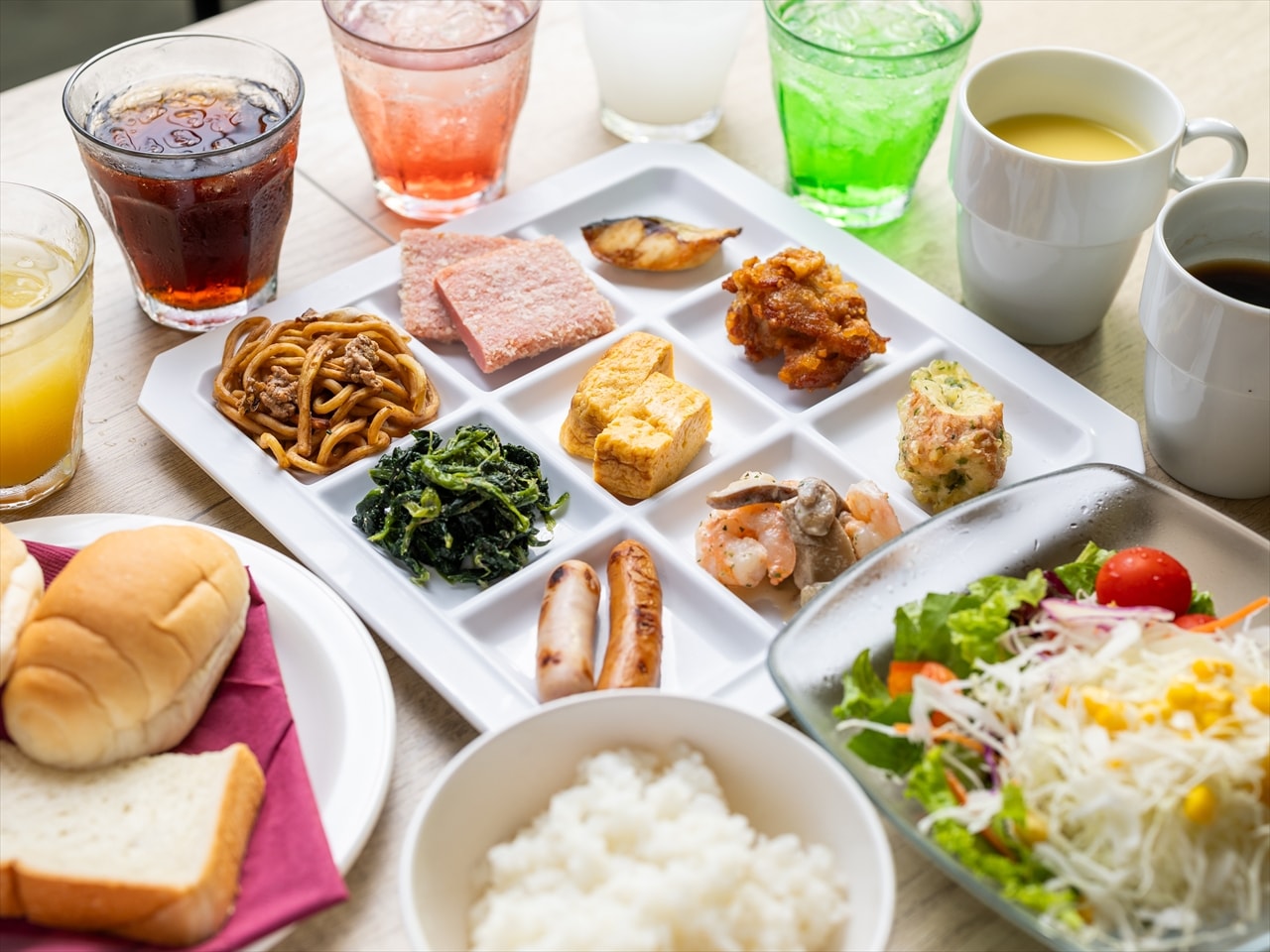 • Salads, cold dishes, side dishes, fried foods, miso soup, consommé soup, rice, mentaiko, natto, shirasu, nori, noodles, bread, desserts, soft drinks, etc.