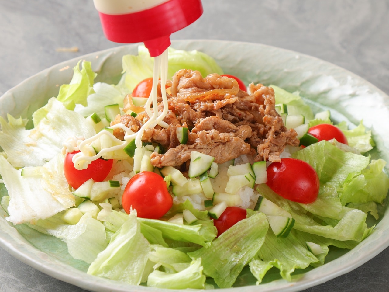 Warm rice topped with sweet and spicy stir-fried meat and your choice of vegetables, finished with mayonnaise.