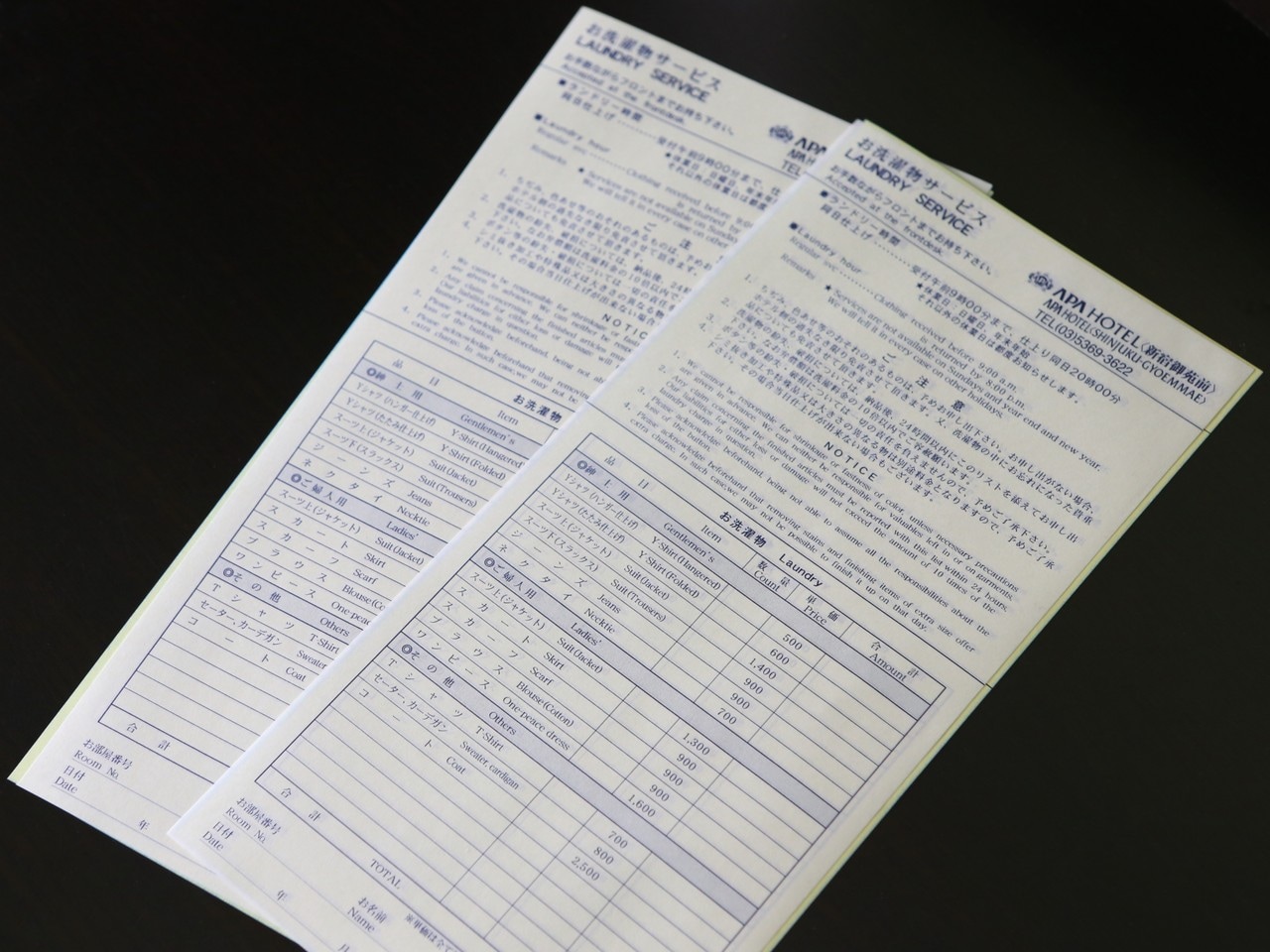 Dry cleaning and clothes-pressing services are available for all guests. Please fill out and place the provided laundry ticket (placed inside the drawer) in the laundry bag, and bring it to the front desk.
