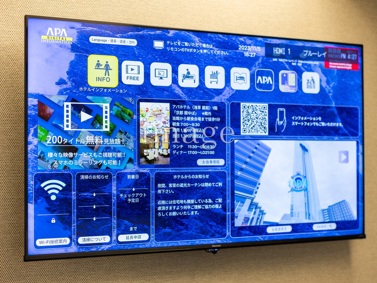 [ APA Digital Information ] APA Digital Information indicates every information of the hotel on the TV screen ( equipped with screen-mirroring ). The design has been redesigned.